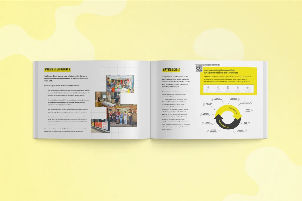 The One Howard Street Economic Recovery Plan uses bold graphics to complement the bold ideas outlined in the document. Every spread packs a punch for the viewer and reader alike.